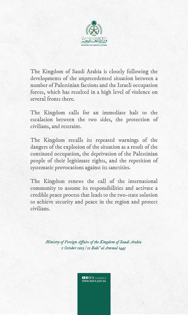 사우디 외교부는 7일(현지시각) 성명을 통해 "몇몇 팔레스타인 파벌과 이스라엘 점령군 사이에 전례 없는 상황이 전개되는 것을 면밀히 관찰하고 있다"면서 "이로 인해 여러 전선에서 높은 수준의 폭력 사태가 발생했다"고 말했다.