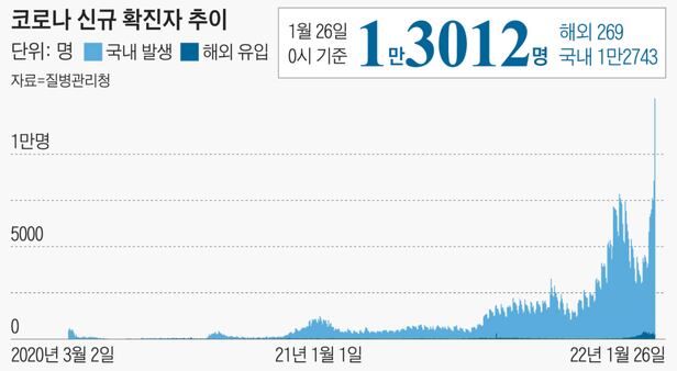 신종 코로나 바이러스 감염증(코로나19) 오미크론 변이가 빠르게 확산하면서 26일 하루 확진자 수가 처음으로 1만명을 넘어섰다. 질병관리청 중앙방역대책본부(본부장 정은경 청장)는 이날 0시 기준으로 코로나19 신규 확진자는 총 1만3012명이라고 밝혔다.