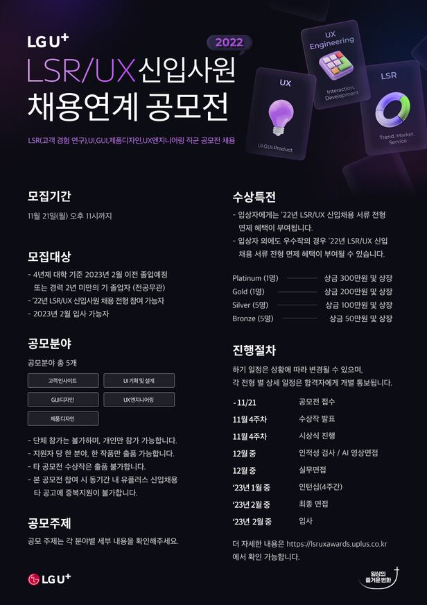 김지혁 LG유플러스 LSR/UX담당(상무)은 "학력과 전공 상관없이 직무에 대한 역량을 검증해 성장 가능성이 높은 우수 인재를 확보하기 위해 매년 공모전을 진행하고 있다"며 "LG유플러스와 함께 고객경험 혁신을 창출할 많은 인재들이 지원하기를 기대한다"고 말했다.
