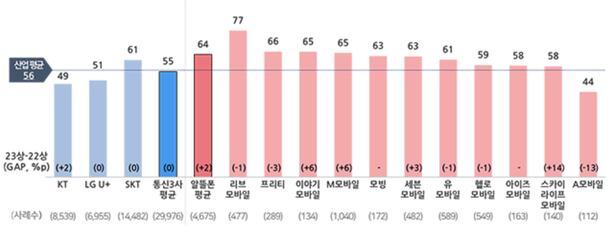 알뜰폰은 2020년 상반기부터 통신 3사 평균을 앞지르고 있다. 2021년 하반기부터는 통신 3사 중 부동의 1위인 SK텔레콤도 따돌렸다.
