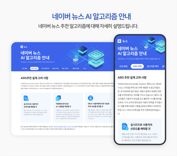 네이버가 지난 6일 네이버 뉴스 인공지능(AI) 알고리즘 안내 페이지를 보다 구체적이고, 이용자가 쉽게 이해할 수 있도록 새롭게 선보였다고 7일 밝혔다.