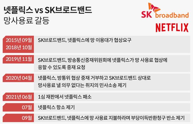 두 회사의 분쟁은 2019년 11월 SK브로드밴드가 방송통신위원회에 망 사용료 협상을 중재해 달라는 내용의 재정 신청을 내면서 시작됐다. 방통위의 중재에도 넷플릭스는 이를 거부했고, 2020년 4월 넷플릭스가 SK브로드밴드를 상대로 채무부존재 확인 소송을 제기하면서 법적 분쟁으로 번졌다.