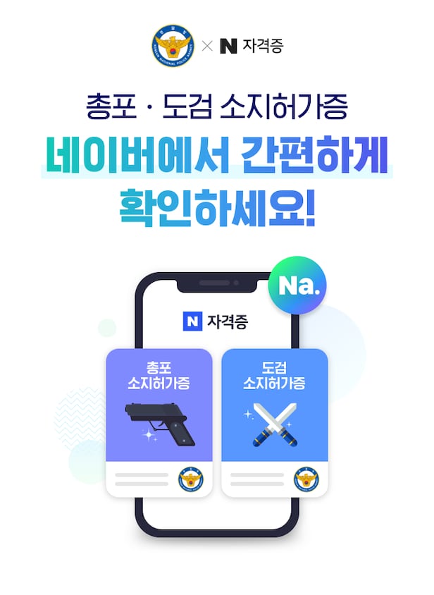 이번 협약으로 석궁, 전자충격기, 총포, 도검, 분사기 등의 소지 허가를 받거나 화약류관리 또는 제조책임 면허를 보유하고 있는 약 50만 명의 사용자들은 네이버 자격증 서비스에서 본인인증을 통해 안전하게 허가증을 보관하고 활용할 수 있다.