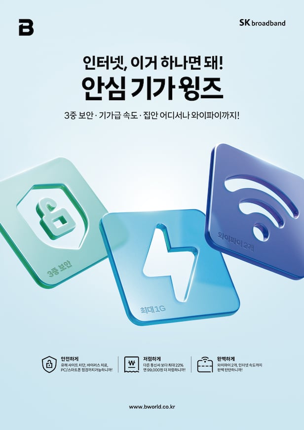 SK브로드밴드는 기존의 보안 부가서비스를 하나로 묶어, 고객이 한 번 가입으로 유해사이트·악성코드 차단, 바이러스 감시·치료, PC·스마트폰 원격 및 방문 점검 등 3중 보안 기능을 이용할 수 있는 '안심 기가 윙즈'를 선보인다고 25일 밝혔다.