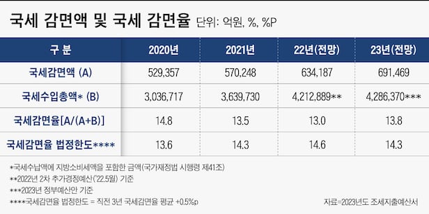 내년 국세 감면액은 69조1469억원으로, 올해 국세 감면액 전망치인 63조4187억원보다 9% 늘었다. 이 같은 국세감면액은 국세수납액과 지방소비세를 합한 국세수입 총액(428조6370억원)의 13.8%에 해당되는 규모다. 역대 최대 규모의 국세 감면액이지만, 직전 3년 국세 감면율 평균에 0.5%P를 더한 값인 국세 감면율 법정 한도 14.3%를 넘지는 않았다.