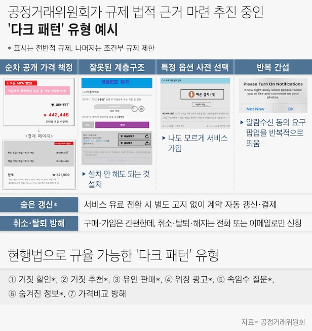 공정위는 이런 유형 중 현행 전자상거래법 등으로도 충분히 규제 가능한 것들이 있다고 밝혔다. 다만 숨은 갱신, 순차 공개 가격 책정, 잘못된 계층 구조, 특정 옵션 사전 선택, 취소·탈퇴 방해, 반복 간섭 등 6개 유형은 법적 근거를 새로 마련해야 할 필요가 있다고 밝혔다. 공정위는 "현행법 적용이 어려운 6개 행위 규율을 위해 다크패턴에 대한 금지 행위 규정을 신설하는 방안 등을 당정 협의에서 보고했고, 국회에 이런 내용을 담은 전자상거래법 개정안이 발의되면 입법 논의를 적극 뒷받침할 계획"이라고 했다.