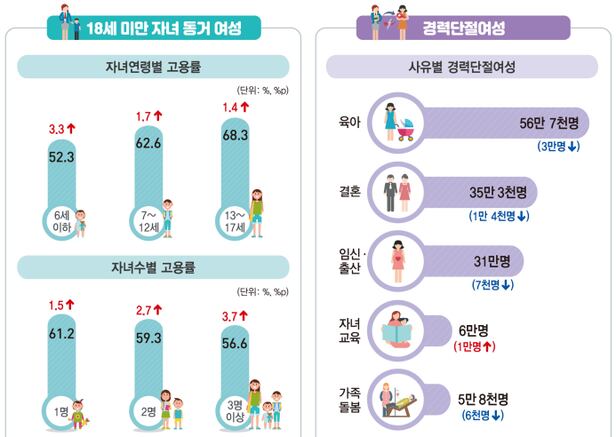 자녀수에 따른 고용률도 자녀가 많을수록 상승폭이 커졌다. 자녀가 1명인 기혼여성의 고용률은 61.2%로 전년 대비 1.5%p 올랐고, 자녀 2명을 둔 기혼여성의 고용률은 59.3%로 2.7%p 상승했다. 자녀 3명 이상인 기혼여성의 고용률은 56.6%로 전년 대비 3.7%p 상승했다.