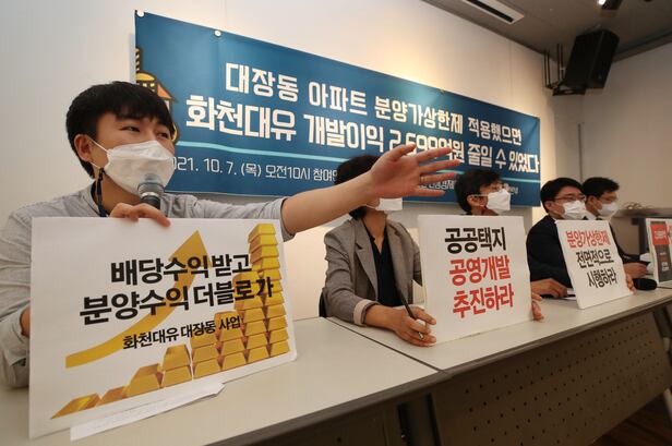 참여연대 민생희망본부와 민변 민생경제위원회는 7일 서울 종로구 참여연대 사무실에서 기자회견을 열고 대장동 개발지구 아파트에 분양가 상한제가 적용됐다면 화천대유의 분양 매출이 1조3890억원에서 1조1191억원으로 2699억원 줄었을 것이라고 분석했다.