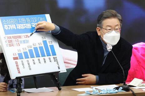 이재명 더불어민주당 대선 후보가 지난 6일 한국의 코로나 시기 소상공인 지원 등 국내총생산(GDP) 대비 재정지원 비율이 다른 나라보다 낮다고 비판하면서 "개인부채는 시간이 지나서 못 갚으면 파산하지만, 국가부채는 이월이 가능하다"고 말했다. 적극적 재정지원으로 국가부채가 늘더라도 개인부채를 줄이자는 주장을 하는 가운데 나온 발언이다.