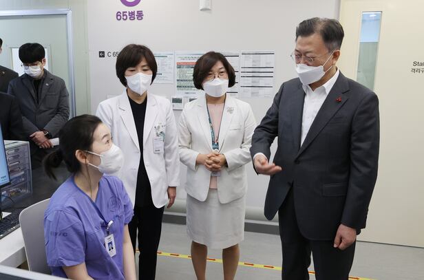 문 대통령은 김충종 감염내과 실장과 진예은 간호사의 설명을 들었다. 김 교수는 "중증환자 중에서도 백신을 맞은 환자와 맞지 않은 환자의 차이가 많다. 백신 추가 접종을 꼭 해야 한다"고 했다. 문 대통령은 "이 부분은 언론이 잘 전달해달라. 의료진의 아주 간곡한 당부 말씀"이라고 말했다.