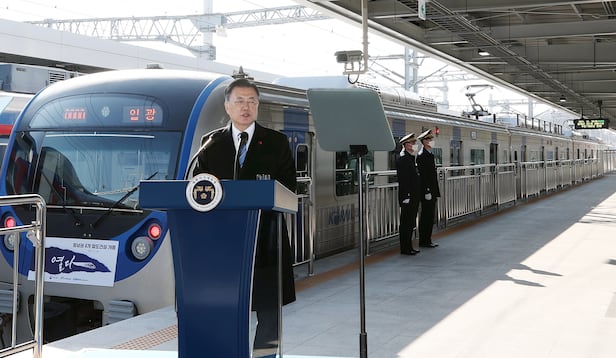문 대통령은 이날 울산 태화강역에서 개최된 동남권 4개 철도 개통식에 참석한 후, 태화강역에서 부산 일광역으로 이동하는 광역철도에 탑승한 자리에서 이같이 말했다. 이어 "부산이 2030년에 엑스포(개최)를 추진하고 있다"며 "그것이 되려면 가덕도 신공항이 2029년에 개항되는 것이 꼭 필요하다"고 말했다.