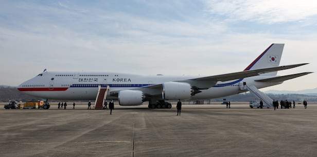 문재인 대통령의 새해 중동 3개국 순방에 투입되는 신형 공군 1호기가 15일 성남 서울공항에서 출발 준비를 하고 있다. 보잉747-8i 기종이며, 기존 1호기 대비 항속거리 및 순항속도가 증가되었고, 내부 개조를 통해 회의공간 및 편의성이 증대되었다. /연합뉴스