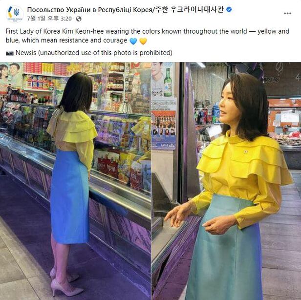 주한 우크라이나 대사관은 지난 1일 공식 페이스북 계정에 "저항과 용기를 뜻하는 노란색과 파란색을 입은 한국의 영부인(First Lady) 김건희"라는 영어로 된 글을 올렸다. 글에는 파란색과 노란색 하트도 포함됐다. 그러면서 김 여사의 앞 모습과 뒷 모습을 담은 두 장의 사진을 게시했다.