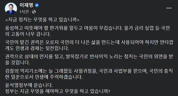 이 대표는 "풍성하고 따뜻해야 할 한가위를 앞두고 마음이 무겁다"며 "국민이 맡긴 권력은 오로지 국민의 더 나은 삶을 만드는데 사용되어야 하지만 안타깝게도 민생과 경제는 뒷전"이라고 지적했다.