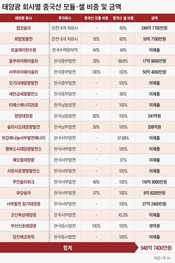 '솔라시도태양광발전'은 모듈의 59%에 셀 전부를 중국산으로 구입해 비용에만 208억원에 달했다. 솔라시도태양광발전은 국내 최대 태양광 발전단지로 알려진 '솔라시도'를 운영하는 곳으로 한국남부발전이 29% 지분을 갖고 있다.
