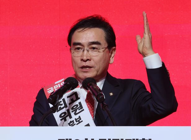 태 의원은 이번 전당대회에 최고위원 후보로 출마했다. 앞서 지난 13일 태 의원은 국민의힘 3·8 전당대회 첫 합동연설회 전 제주 4·3 사건 희생자 추모 공간인 '제주 4·3 평화공원'을 찾아 "명백히 북한 김일성의 지시에 의해 촉발됐다"고 발언해 논란이 됐다.
