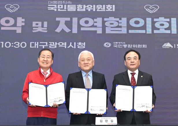 김 위원장은 이날 국민통합위와 대구광역시·시의회가 업무협약을 체결하고 지역협의회를 가진 자리에서 "대구광역시와 우리 사회가 가지고 있는 다양한 갈등 문제와 통합 과제를 풀어나갈 지혜를 모으고자 한다"고 말했다.