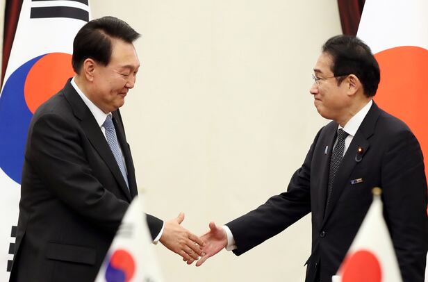 윤석열 대통령과 기시다 후미오 일본 총리는 12일(현지 시각) 리투아니아 빌뉴스에서 한일 정상회담을 가진 후 "한·미·일 3국 정상회의에 대한 미국의 제안을 환영한다"고 밝혔다.