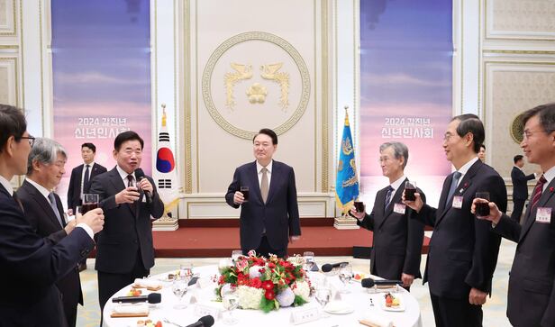 윤석열 대통령은 3일 오전 청와대 영빈관에서 5부 요인(국회의장, 대법원장, 헌법재판소장, 국무총리, 중앙선거관리위원장) 등 국가 주요 인사들이 함께하는 2024년 신년 인사회에 참석했다. 윤 대통령은 참석자들과 국정운영의 각오를 다지며 덕담을 나눴다.