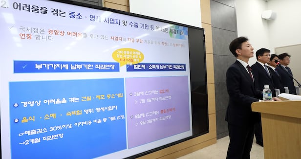 하지만 국세청은 복합 경제위기로 어려움을 겪는 건설‧제조 중소기업과 음식‧소매‧숙박업 영위 영세사업자의 자금 부담을 덜어주기 위해 따로 신청을 하지 않더라도 직권으로 납부기한을 2개월(3월 25일) 연장한다. 납부기한 연장 대상자는 건설·제조업 20만명, 음식·소매·숙박업 108만명 등 총 128만명이다.