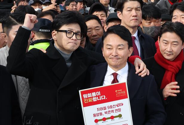 한 위원장은 이날 오후 인천 지하철 1호선 박촌역을 찾아 "국민의힘은 계양에서 출발한다. 이번 4월 10일 총선은 원희룡과 함께 출발한다. 반드시 이길 것"이라며 원 전 장관을 치켜세웠다. 이 과정에서 한 위원장과 원 전 장관은 함께 어깨동무를 한 채 주먹을 불끈 쥐고 파이팅을 외치기도 했다.