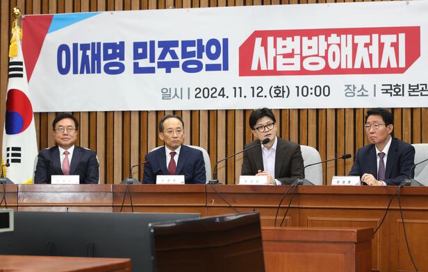 한 대표는 이 대표 선고를 사흘 앞둔 12일 추경호 원내대표 등 당 지도부, 당 소속 국회 법제사법위원들과 함께 긴급대책회의를 열었다. 주말마다 장외집회를 열어 민생 현장의 혼란을 자초하고, 국회에선 예산 편성 등을 무기로 사법부를 압박하고 있다며 민주당을 향해 맹폭했다.