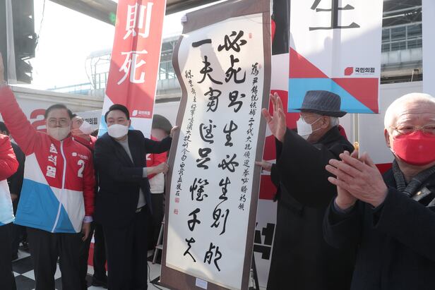 윤석열 국민의힘 대선 후보가 3일 충무공 이순신 장군의 후손으로부터 '필사즉생 필생즉사 일부당경 족구천부(必死則生 必生則死 一夫當逕 足懼千夫)'라고 적힌 족자를 받았다. 해당 글귀는 '반드시 죽으려 하면 살고, 반드시 살려 하면 죽는다. 한 사람이 길목을 잘 지키면 1000명의 사람도 두렵게 할 수 있다'는 뜻으로 명량해전을 앞두고 이순신 장군이 부하들에게 훈시(訓示)한 말로 전해진다.