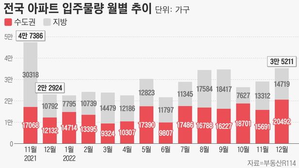 22일 부동산R114자료에 따르면 12월 전국 아파트 입주 예정 물량은 3만5211가구로 지난해 같은 기간(2만2924가구) 보다 54%(1만2287가구) 늘었다.