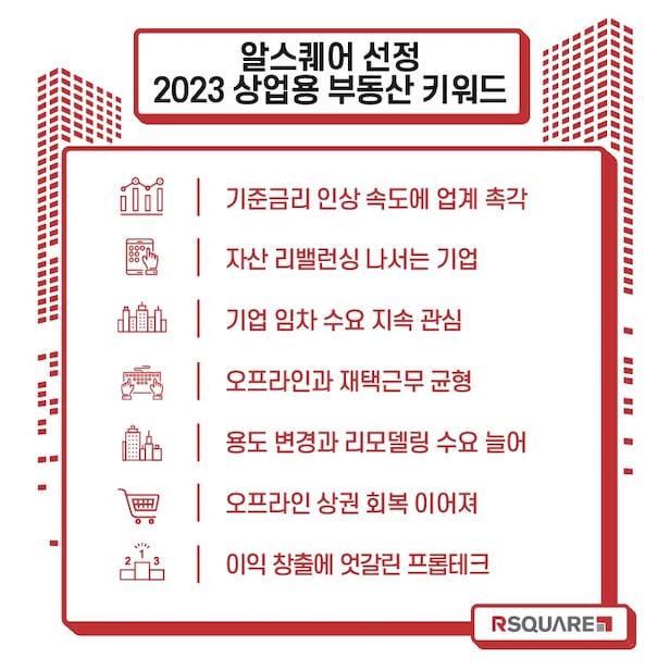 알스퀘어는 상업용 부동산 업계가 금리 인상 속도에 촉각을 곤두세우고 있다고 분석했다. 연초만 해도 팬데믹 완화에 따른 경제 활동 재개와 풍부한 유동성으로 호황이 기대됐지만, 미국의 가파른 기준금리 인상으로 하반기 들어 급격히 기대감이 꺾였기 때문이다.