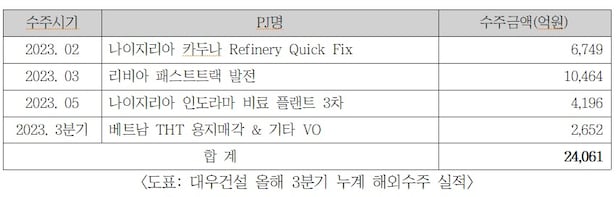 대우건설은 올해 2월 나이지리아 '카두나 정유시설 긴급 보수 공사(Kaduna Refinery Quick Fix PJ)'를 5억 8918만 달러(한화 약 7255억원)에 계약하며 마수걸이 수주를 달성한 바 있다. 연이어 3월에도 리비아에서 7억9000만 달러(한화 약 1조500억원) 규모의 패스트트랙 발전 공사 계약을 체결했다. 지난 10월에는 1억3000만 달러 규모의 이라크 알포 컨테이너 터미널 상부시설 연약지반 개량공사를 수주했다.