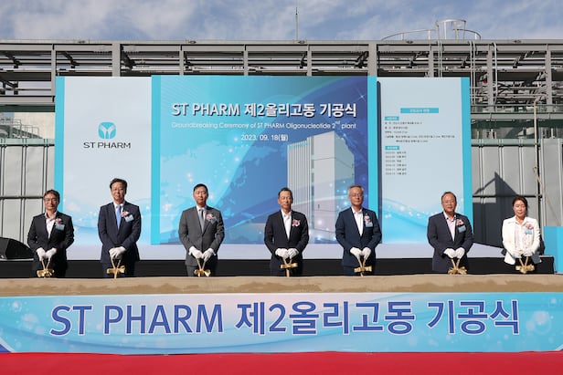 에스티팜은 지난 18일 경기 안산 반월캠퍼스 부지에서 제2올리고 공장 기공식을 열었다고 19일 밝혔다. 기공식에는 동아쏘시오그룹 강정석 회장 및 에스티팜 김경진 사장, 동아쏘시오홀딩스 정재훈 사장, 동아에스티 김민영 사장, 동아제약 백상환 사장 등 각 그룹사 사장단이 참석했다.