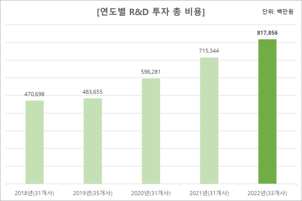 작년 주요 임상 연구 중 항암제 연구 비중이 약 76%, 희소질환 연구 비중이 약 11.8%였다. R&D 분야 활동 인력은 총 2055명으로, 2018년 이후 증가해 왔다는 분석이다.