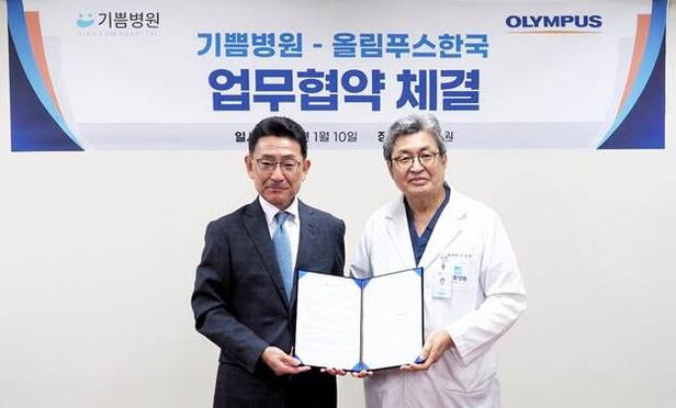 ▲글로벌 의료기업 올림푸스한국이 10일 서울 서초구 기쁨병원과 내시경 진단 및 치료 분야 첨단화를 위한 업무 협약(MOU)를 맺었다고 밝혔다. 이번 MOU를 통해 기쁨병원은 국내병원 최초로 올림푸스한국의 최신 내시경 시스템인 '이비스 엑스원(EVIS X1)'과 대장내시경 검사 보조 AI 시스템 '엔도브레인 아이(EndoBRAIN-EYE)'를 모두 도입한다. 이와 더불어 올해 올림푸스에서 출시하는 최신 스코프도 도입할 예정이다.