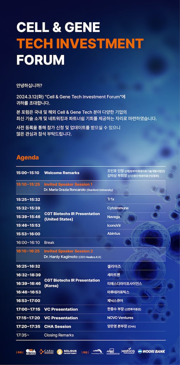 차바이오그룹·첨단재생의료산업협회(CARM)·솔리더스인베스트먼트가 공동주최하고, 아시아 태평양 생명의학 연구재단(APBRF)과 바이오·헬스 전문 투자사 포워드에퀴티파트너스·마티카 바이오테크놀로지가 후원한다.