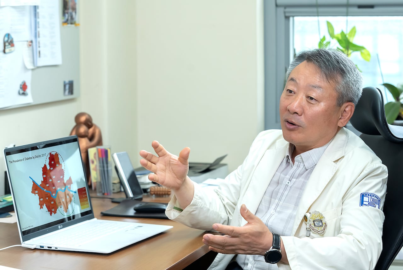 "서울만 놓고 봤을 때 소득 수준이 높은 강남 3구를 제외한 지역에서 비만형 당뇨 인구가 빠르게 늘고 있다. (모니터의 지도를 손으로 가리키며) 이런 건강 격차에 대한 연구가 절실한데, 서울시나 정부에서 손을 놓고 있는 것 같아 걱정이다. 그나마 다행이라면 요즘 효과 좋은 신약들이 많이 개발되고 있다."