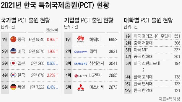 특허청에 따르면 한국은 지난해 국제특허(PCT) 2만60건을 출원해 중국 6만9540건, 미국 5만9570건, 일본 5만260건에 이어 세계 4위를 차지했다.