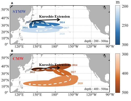 그런데 수심 200~500m에 해당하는 '아표층'에서는 세슘이 전혀 다른 방향으로 퍼졌다. 연구팀은 아표층을 수심 200~300m 부분과 300~500m 부분으로 나눠 세슘이 어떤 식으로 확산하는지 시뮬레이션을 수행했다. 그 결과 두 수심에서 모두 세슘이 남쪽으로 퍼진 다음 쿠로시오 해류 영향을 받아 동쪽으로 갔다가 다시 일본 남동쪽에 돌아오는 것으로 분석됐다.