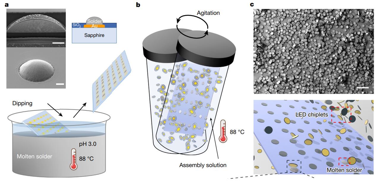 국내 연구진이 스마트폰, TV, 모니터와 같은 전자제품 디스플레이에 널리 쓰이는 OLED(유기발광다이오드)의 장점을 살리면서 단점은 극복한 차세대 반도체 '마이크로LED'를 안정적으로 양산할 수 있는 기술을 내놨다. 특수 용액에 마이크로LED 부품과 기판을 넣고 흔들면 부품이 알아서 조립되는 신개념 공정이다.