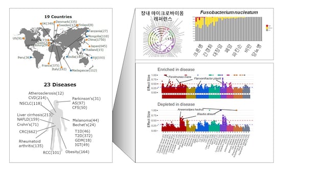 연구진은 북미, 유럽, 남아시아, 동아시아 전역에서 수집된 6014개의 마이크로바이옴 유전체 정보를 분석했다. 빅데이터 분석과 인공지능(AI) 모델을 이용해 특정 질병을 가진 사람에게서 나타나는 마이크로바이옴 특징을 확인하고 특정 박테리아(세균)의 역할을 찾아냈다.