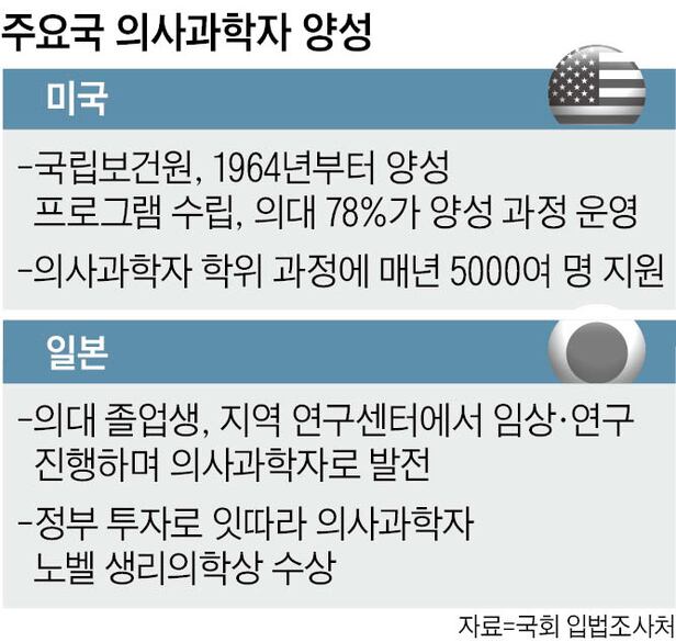 반면 우리나라는 기초 의학 연구를 하는 의사과학자는 찾아보기 어렵다. 매년 의대 졸업생 3000여 명 중 의사과학자로 진로를 선택하는 인원은 1%에 불과하다. 미국은 매년 1000명 안팎 의사과학자가 나오고 있다.