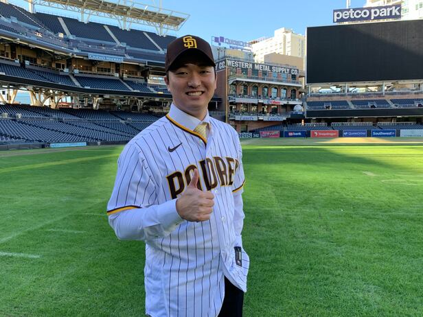 미국프로야구(MLB) 포스팅 시스템(비공개 경쟁입찰) 마감 시한 직전 샌디에이고 파드리스와 계약한 고우석이 새 유니폼을 입고 홈구장 펫코파크에 섰다.