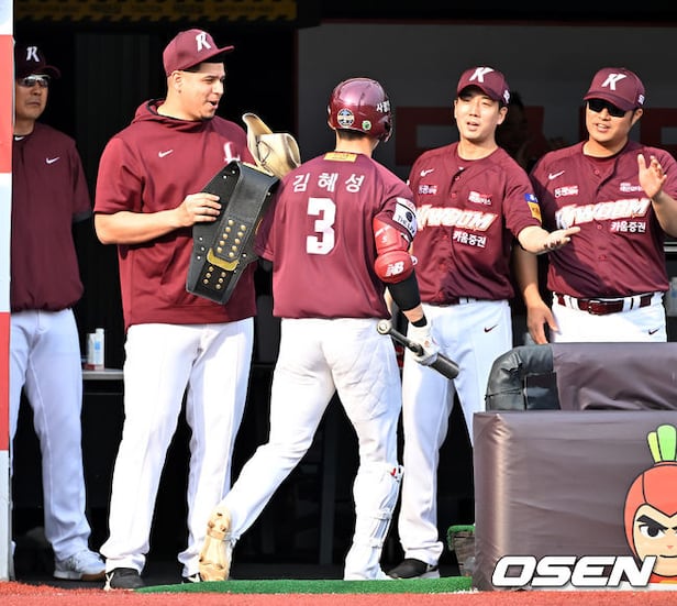 2회초 2사 주자 만루 키움 김혜성이 우월 만루 홈런을 날린 후 덕아웃에서 축하를 받으며 챔피언벨트를 받지 않고 있다. 2023.06.10 / rumi@osen.co.kr