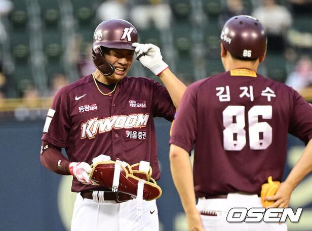 3회초 1사 2루 키움 송성문이 우중간으로 향하는 1타점 적시 2루타를 날린 뒤 기뻐하고 있다. 2023.07.08 /cej@osen.co.kr