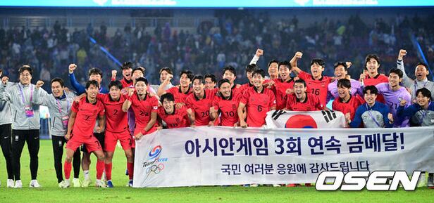 한일전을 승리하며 금메달을 거머쥔 한국 선수들과 황선홍 감독을 비롯한 코칭스태프가 환호하며 기념촬영을 하고 있다. 2023.10.01 / dreamer@osen.co.kr