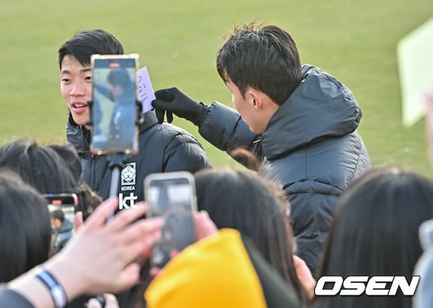 손흥민이 황희찬에 팬 레터를 전달해주고 있다. 2023.11.18 / soul1014@osen.co.kr