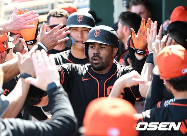 1회초 1사 1루에서 샌프란시스코 자이언츠 라몬테 웨이드 주니어가 투런 홈런을 치고 더그아웃에서 동료들과 환호하고 있다. 2024.03.04 /sunday@osen.co.kr