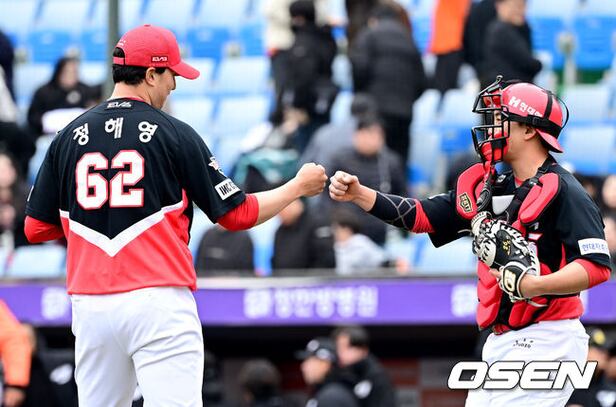경기를 마무리 지은 KIA 투수 정해영과 포수 한승택이 인사를 나누고 있다. 2024.03.11 / dreamer@osen.co.kr