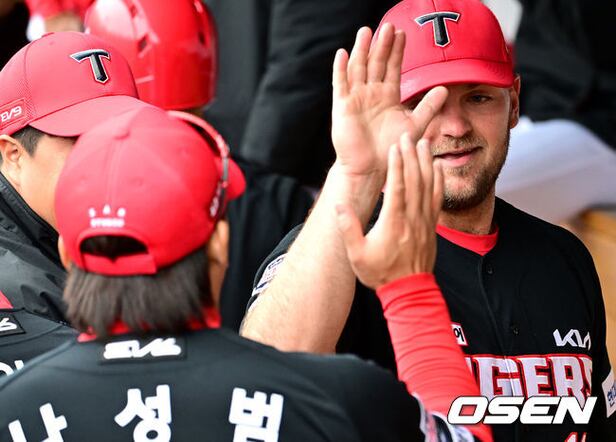 4회말 한화 공격을 삼자범퇴로 막아낸 KIA 선발 윌 크로우가 나성범과 인사를 나누고 있다. 2024.03.11 / dreamer@osen.co.kr