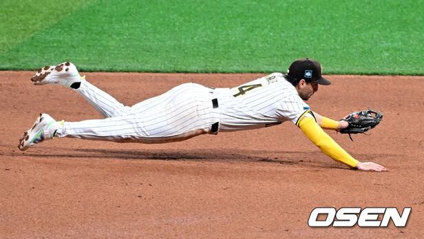 5회초 무사 1루에서 샌디에이고 웨이드가 다저스 오타니의 3루 땅볼 타구를 몸날려 처리하고 있다. 2024.03.20 /jpnews@osen.co.kr