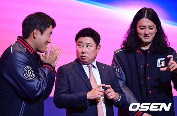 롯데 김태형 감독과 전준우, 김원중이 포토타임을 준비하고 있다. 2024.03.22 /jpnews@osen.co.kr